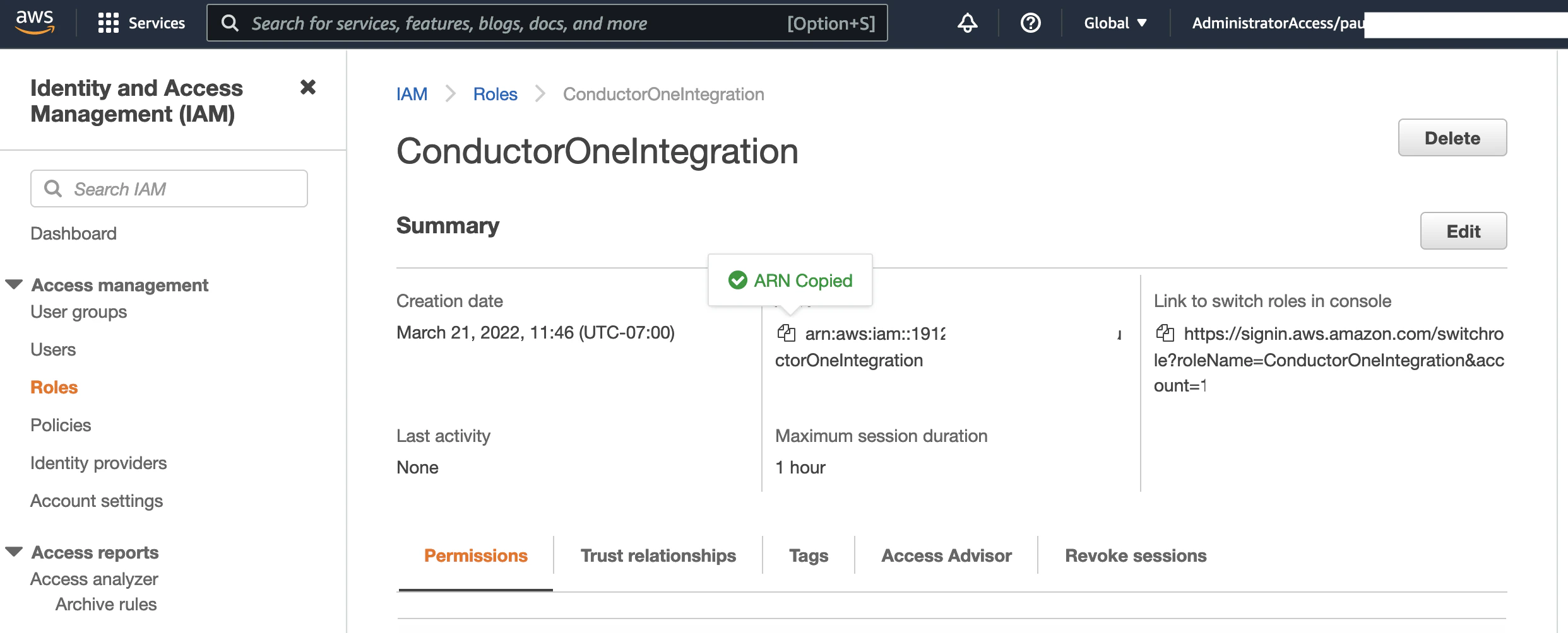 {ROOT_ID} with the root ID from the main account and EXTERNAL_ID_FROM_C1_INTEGRATIONS_PAGE with the External ID you copied from ConductorOne.{ROOT\_ID}:role/ConductorOneService”: This is the trusted entity. It specifies that only the ConductorOne role in your main root account is allowed to assume this role. This ensures that no other account can use this trust policy.